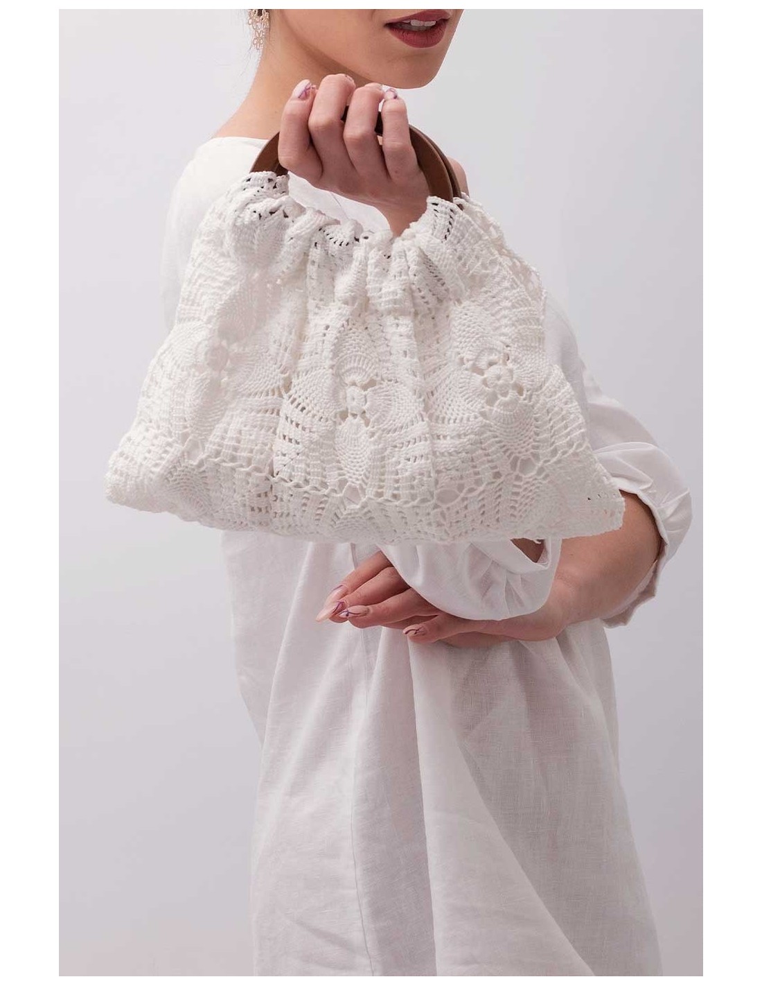 La borsa Cinquenoci è una borsa interamente realizzata a mano con tecnica ad uncinetto e manici rotondi in legno.