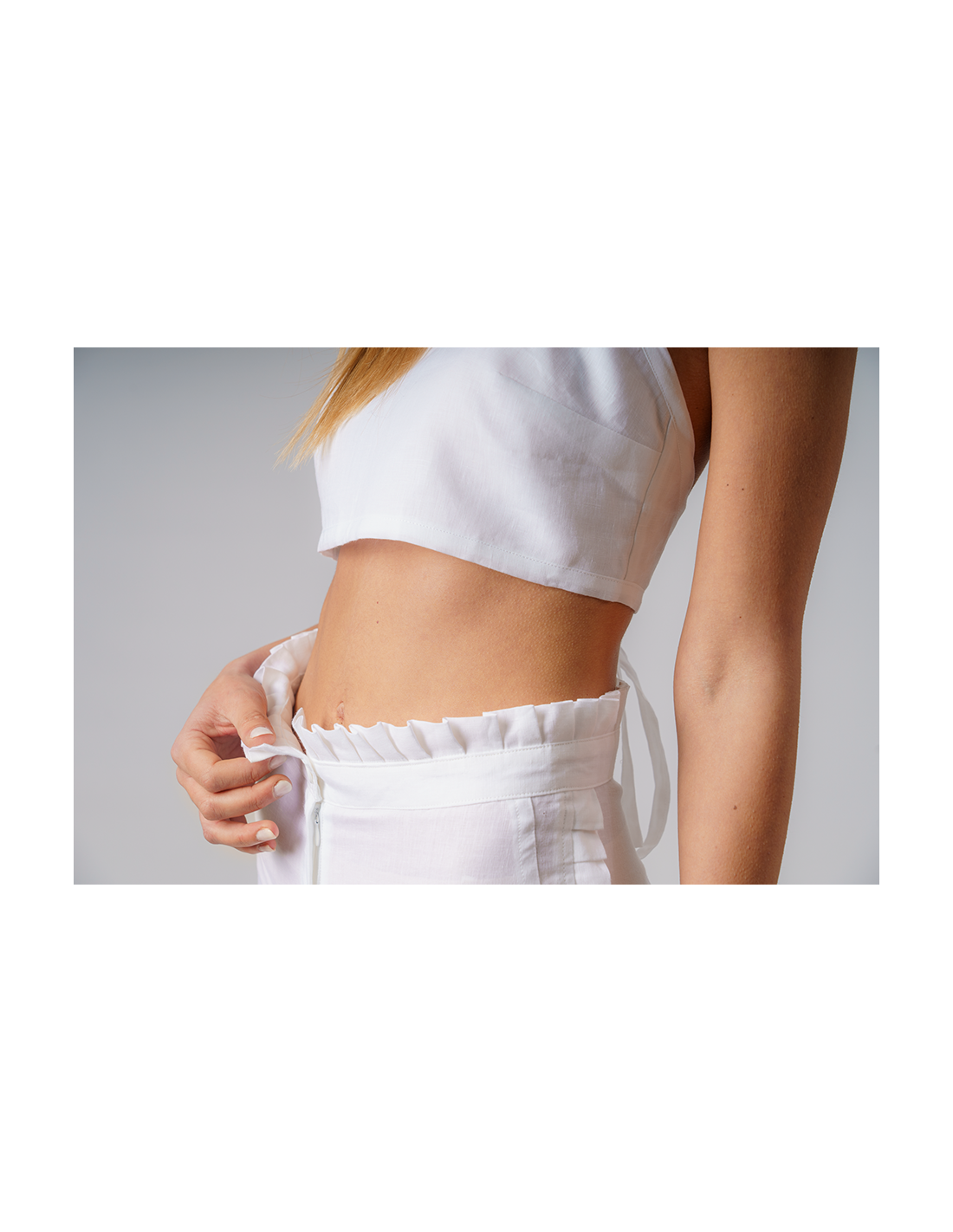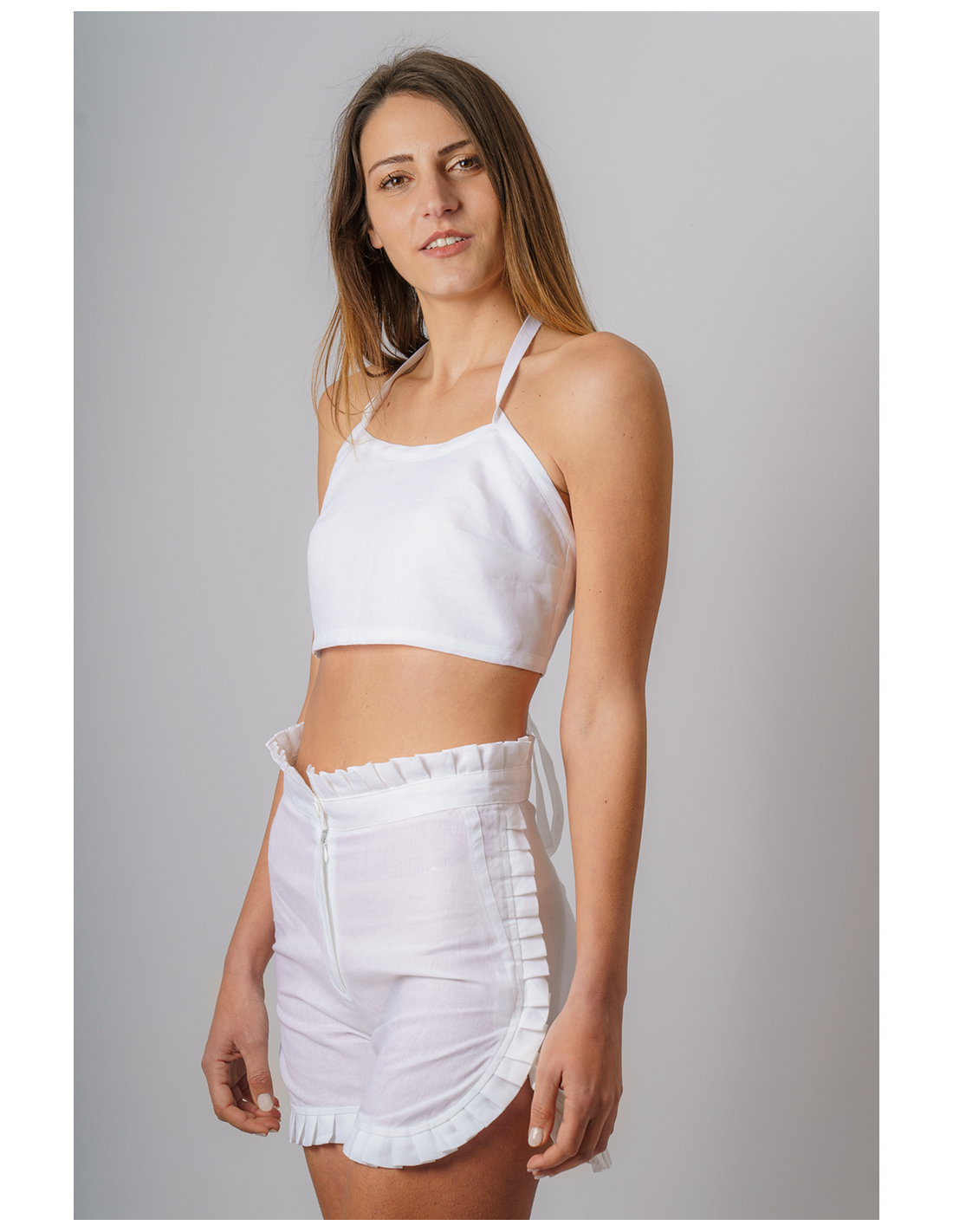 Monopoli è una città dal centro storico prezioso che si affaccia sul mare. L'atmosfera che offre questo antico borgo, ricco di eventi e posti da visitare, sembra richiamare la stessa atmosfera di uno scorcio delle Baleari. Ispirandosi a quest'idea di vacanza, le sarte con le loro mani sapienti hanno realizzato il pantaloncino Monopoli, adatto per le occasioni più glamour dell'estate. Realizzato a mano con 100% puro lino, questo capo d'abbigliamento è un classico che farà sentire la donna elegante e comoda allo stesso tempo. La modella in foto indossa una M.