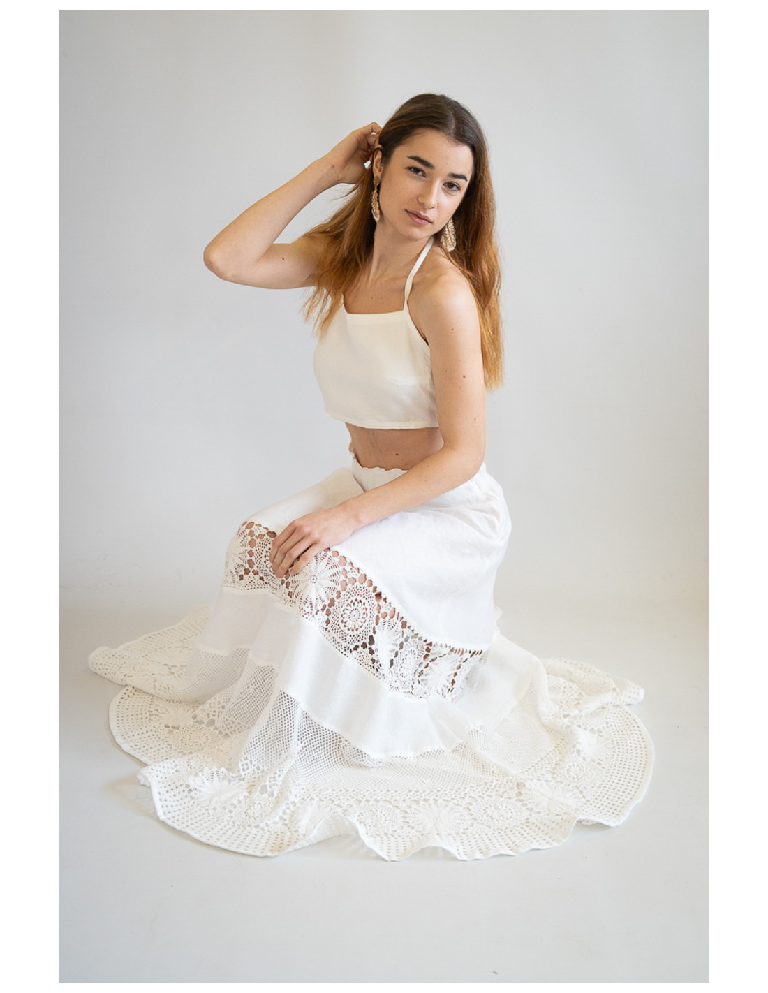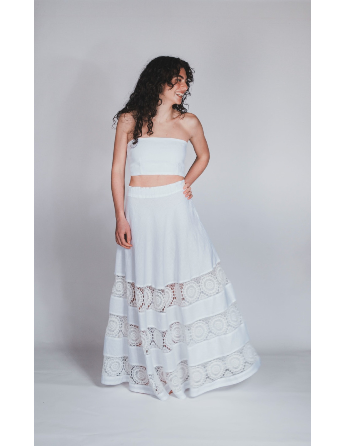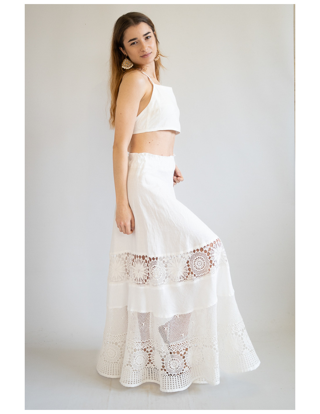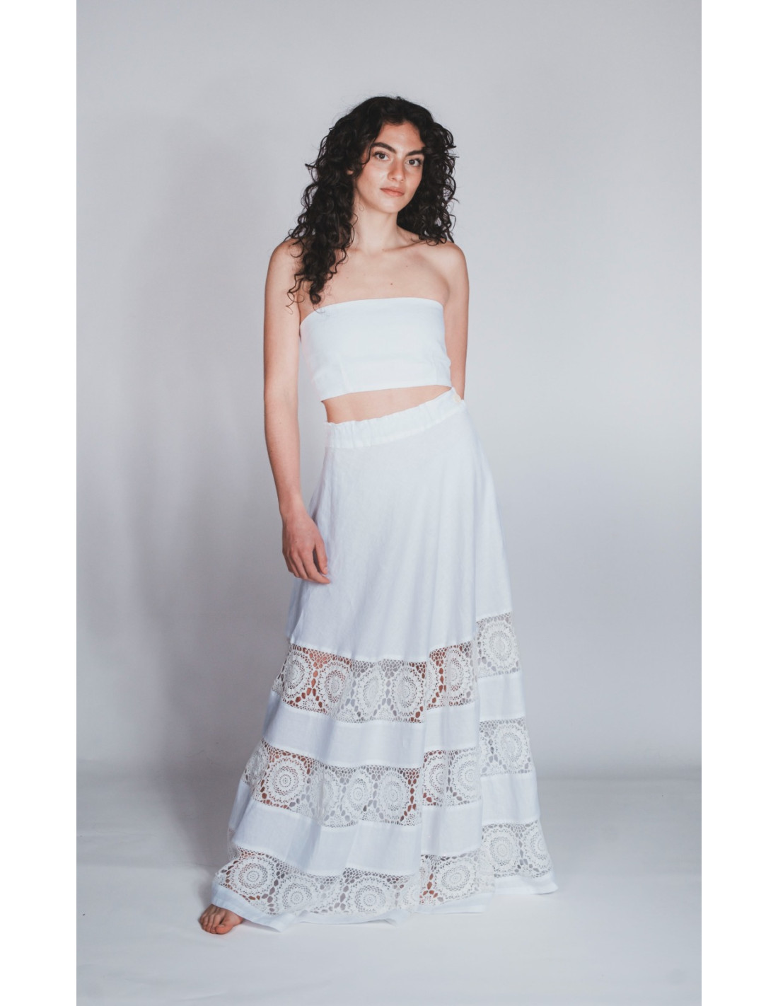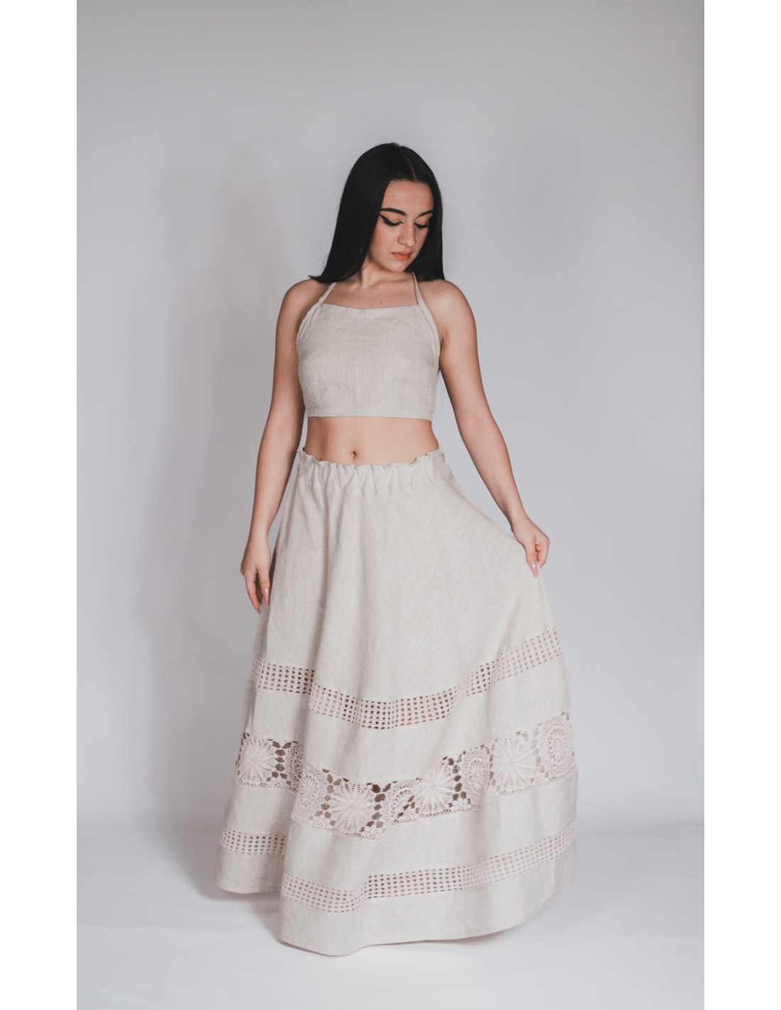 Maxi gonna in puro lino con inserto all’uncinetto. Ispirata alla tradizione salentina di Melpignano.