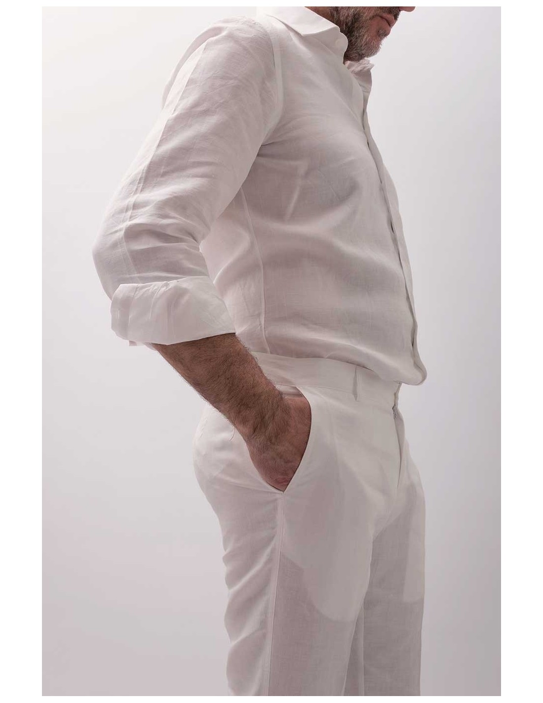 Il Valle D'itria è un pantalone in lino 100% italiano, con risvolto e tasche frontali oblique.