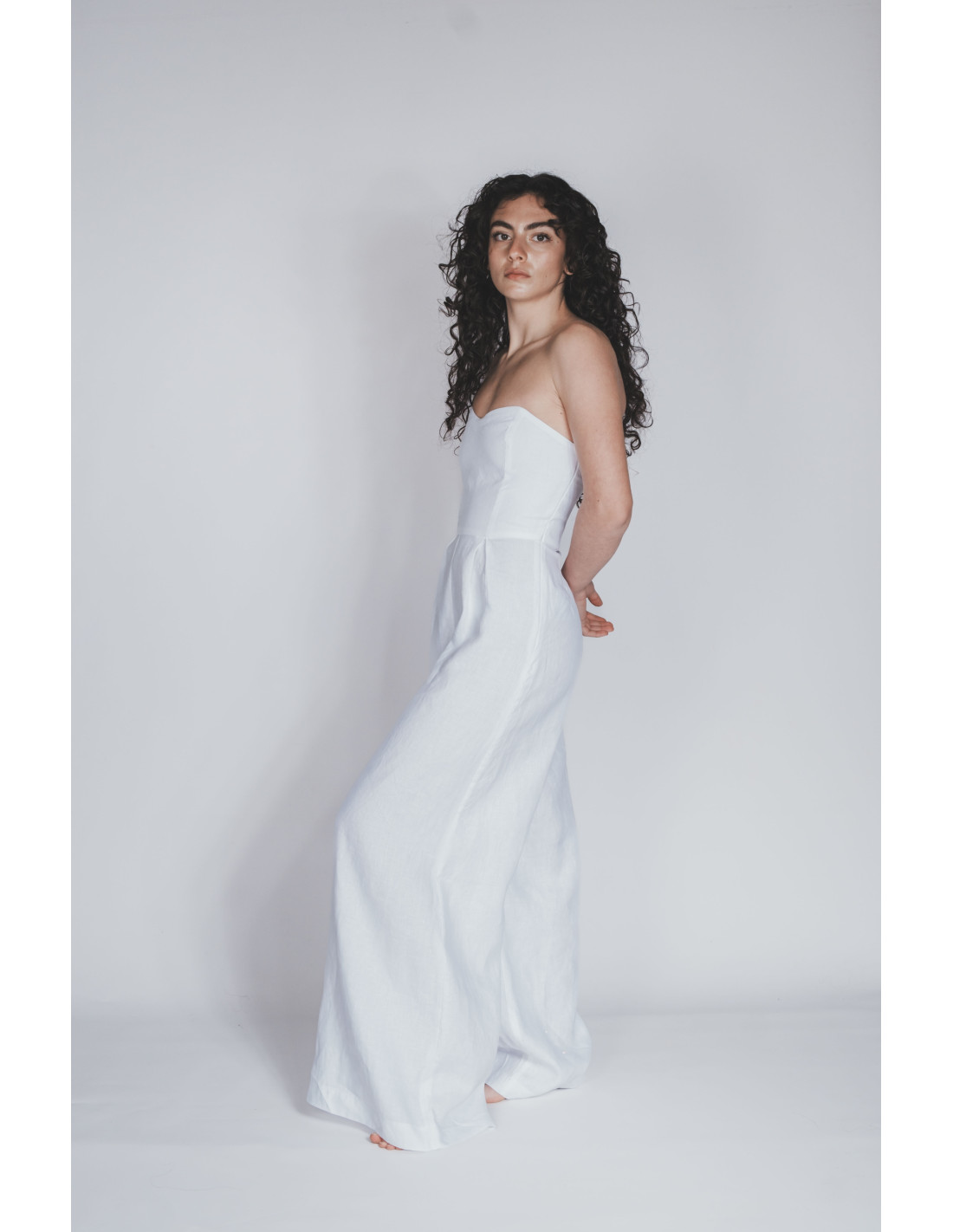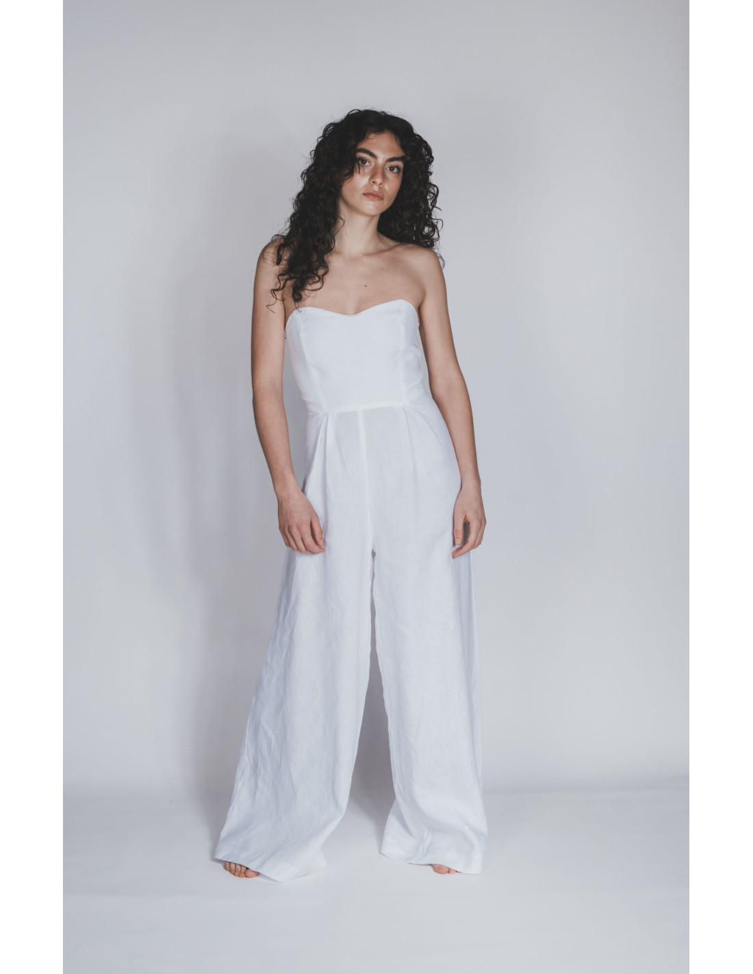Tuta sartoriale in puro lino italiano 100%, dalla linea fluida e raffinata. Ispirata alla sobria eleganza di Martano.