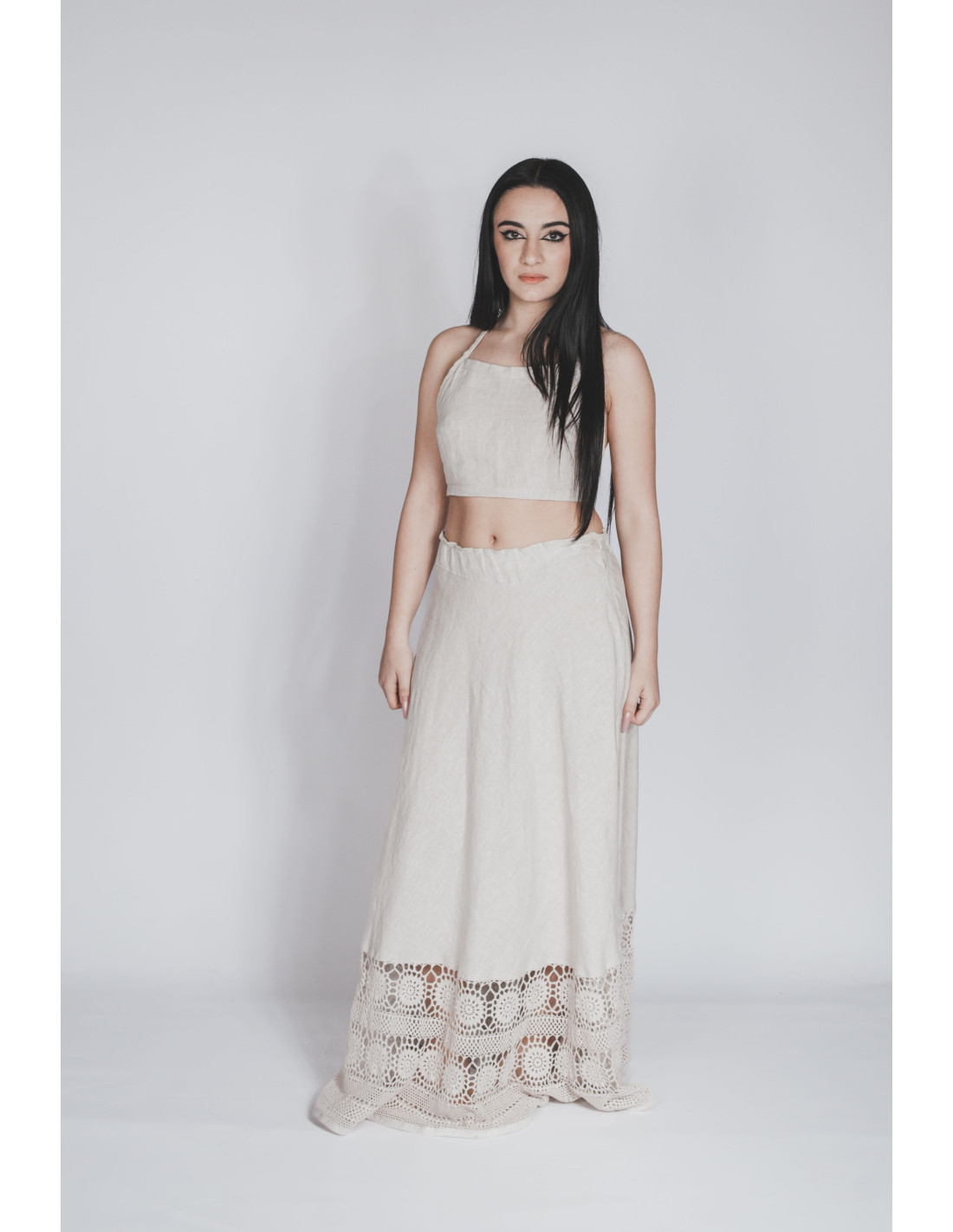 Gonna lunga in lino 100% Made in Italy, dalla linea fluida e naturale, con vestibilità morbida che dona eleganza e leggerezza alla silhouette. Il fondo è impreziosito da una fascia lavorata a mano all’uncinetto, un dettaglio raffinato che crea un delicato contrasto di texture e aggiunge movimento al capo. Un modello femminile e ricercato, perfetto per look estivi sofisticati dal fascino autentico.