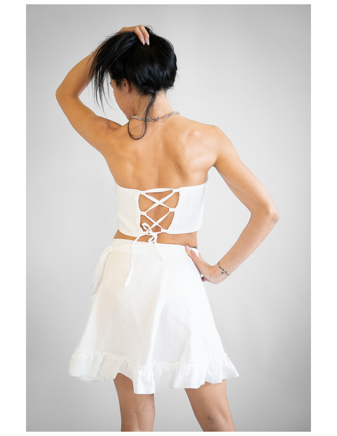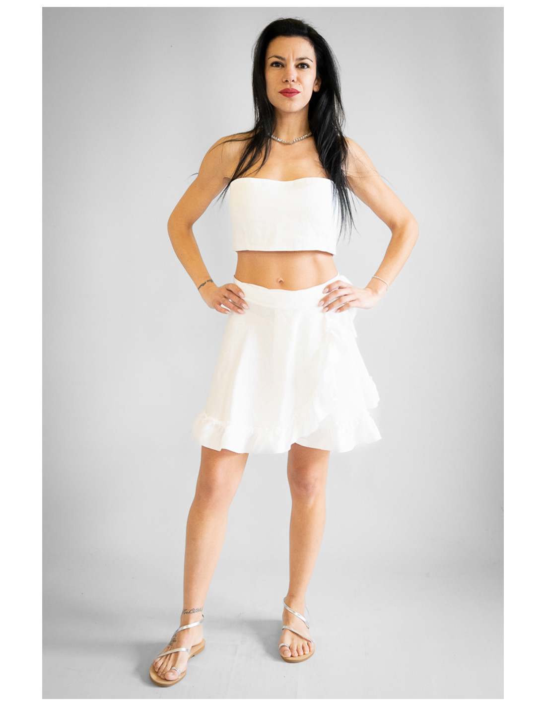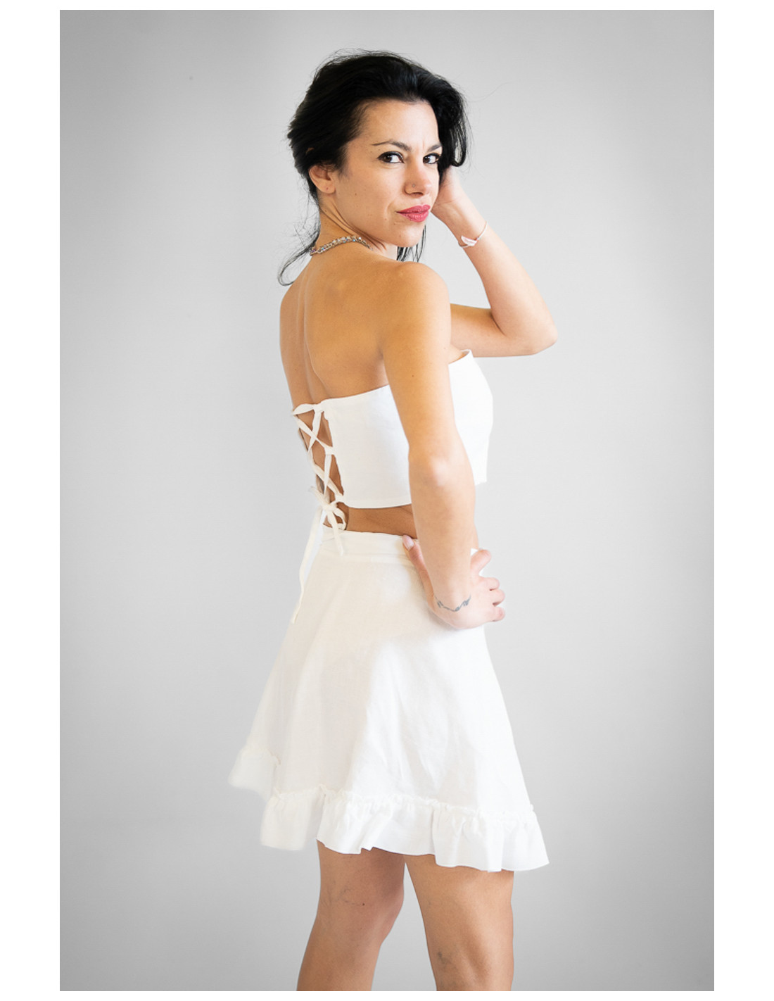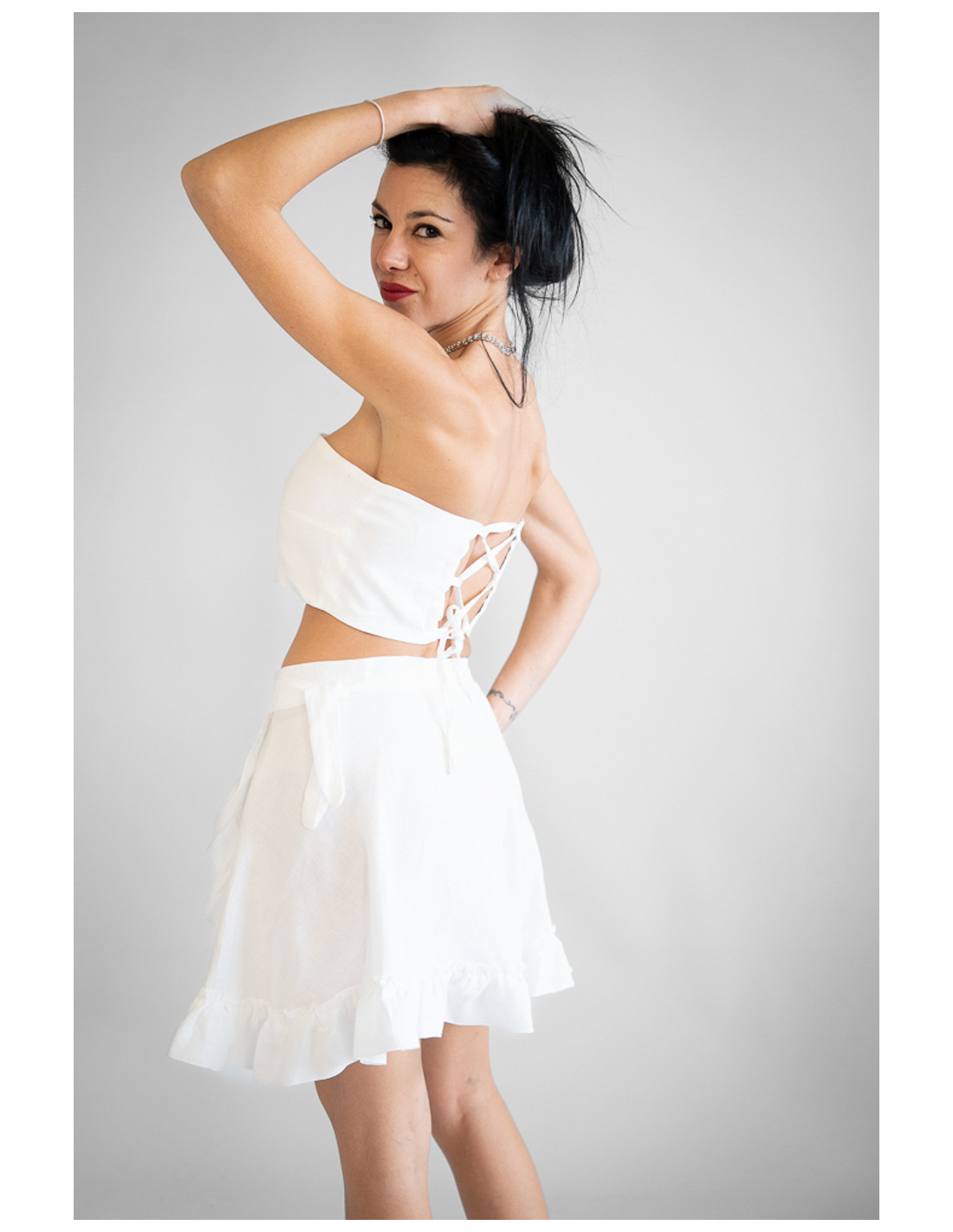 Gonna sartoriale corta in puro lino 100% Made in Italy, fresca e leggera, ideale per la stagione estiva. Modello a portafoglio regolabile, che permette di adattare la vestibilità con comfort e precisione. La linea mezza ruota dona movimento e slancia la silhouette, mentre la rouche aggiunge un tocco femminile e dinamico al design. Un capo elegante e versatile, perfetto per look romantici e contemporanei.