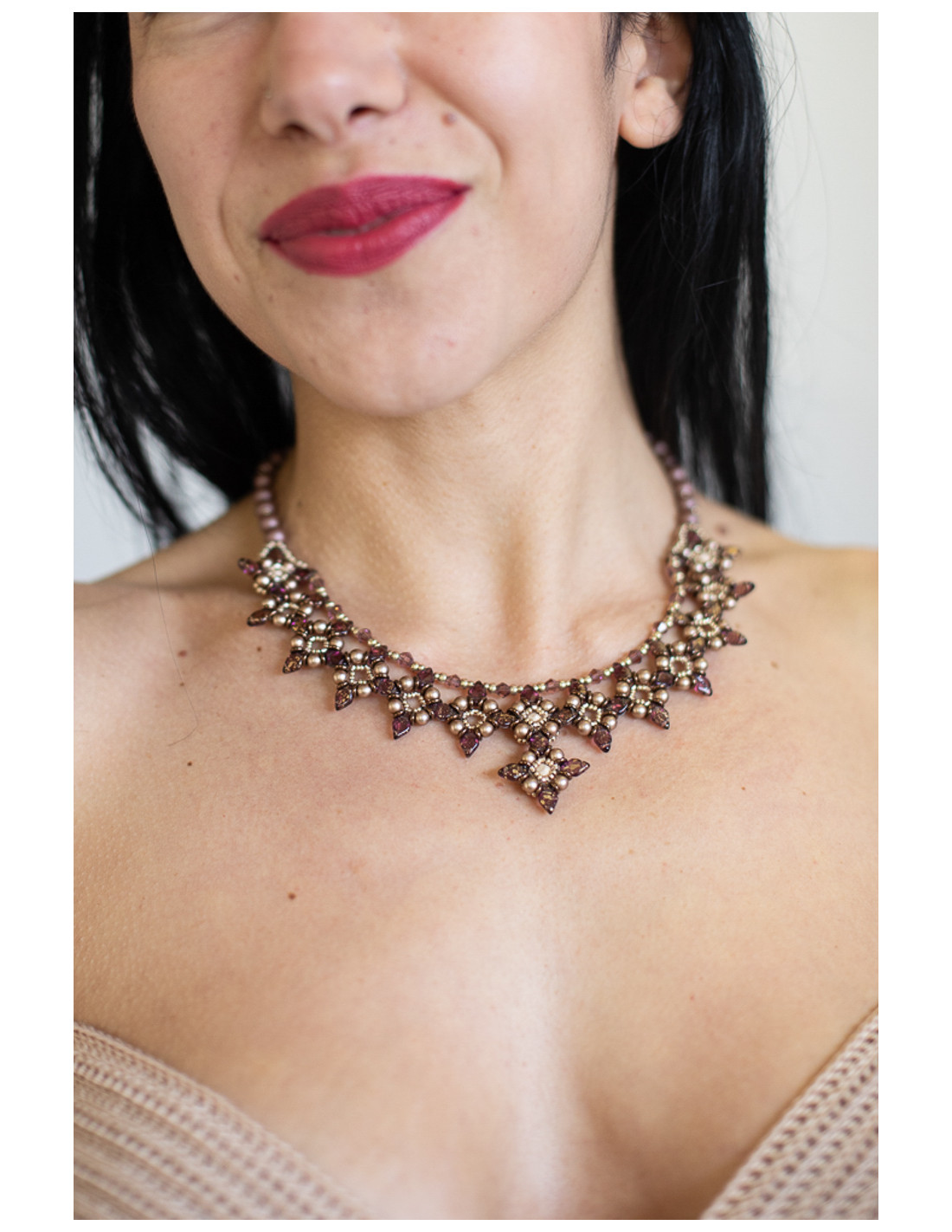 Collana realizzata a mano con perline e Swarovski tessuti con ago e nylon, frutto di una lavorazione artigianale accurata e raffinata. Il design crea un elegante gioco di forme e movimento, esaltato da un pendente centrale che dona luce e carattere alla composizione. Un gioiello femminile e sofisticato, perfetto per valorizzare ogni look con un tocco prezioso e dinamico.
