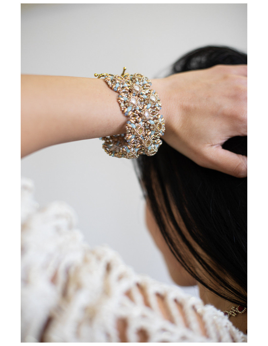 Bracciale realizzato a mano con ago e nylon, realizzato con lavorazione artigianale di alta precisione. Il design è impreziosito da cabochon di perle in vetro, luminosi biconi Swarovski e chaton di cristallo austriaco, che creano un elegante gioco di luce e riflessi. Completa il capo una chiusura in ottone stile tibetano, dettaglio distintivo che dona carattere e unicità all’accessorio. Un gioiello raffinato e ricercato, perfetto per aggiungere un tocco prezioso e sofisticato a ogni look.