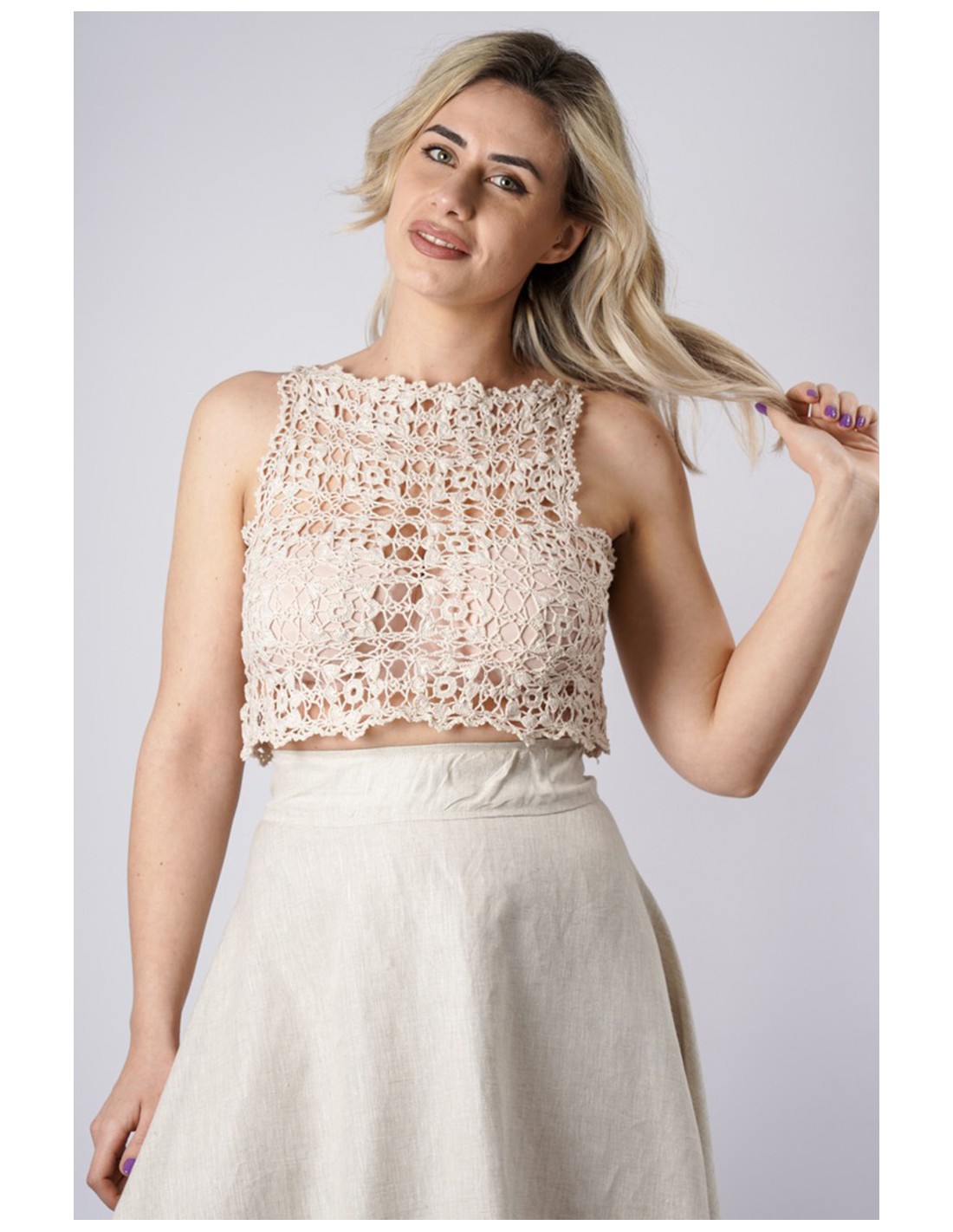 Il Top Casarano prende ispirazione dal borgo di origini romane, dove antichi palazzi e chiese raccontano storie di un passato ricco e affascinante. Realizzato con la tecnica artigianale dell’uncinetto e cotone puro al 100%, questo capo nasce dalle sapienti mani delle sarte di Viale dei Miracoli.